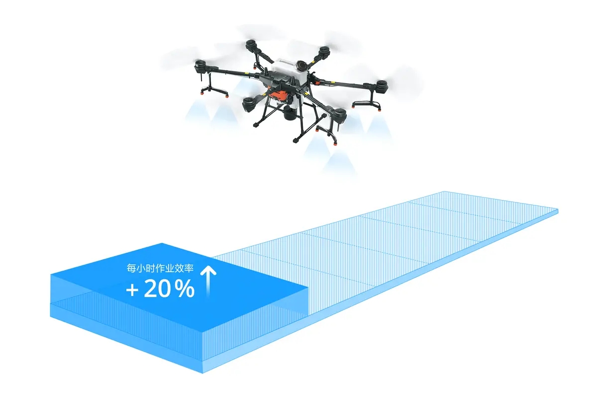 播撒系統 2.0 具備 20L 大容量及 15kg/min 大流量,播撒能力更上一層樓,以水稻直播為例,播撒系統可提供約 70 倍于人工的作業效率。[1]此外播撒系統支持諸多作業場景,草原補播、固體肥料播撒、蝦稻田飼料播撒作業皆可輕松完成,播撒效果均勻出色。播撒系統支持快速換裝,只需 3 分鐘即可裝配至 T20 上,從容面對多種作業需求